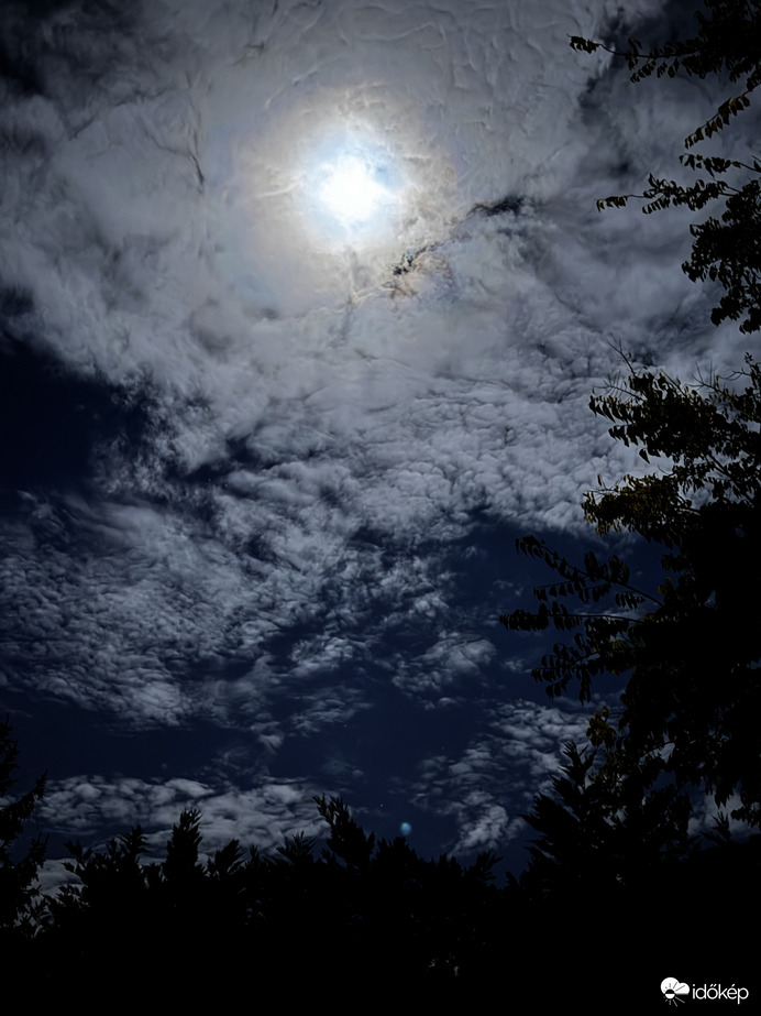 Elmosódott szivárványszínű gyűrű a Hold körül, felszakadozott de sűrű felhők között