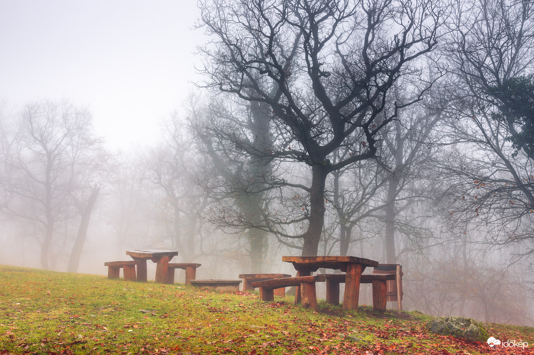 Sasbérci kilátónál található padok, a ködös időben.
