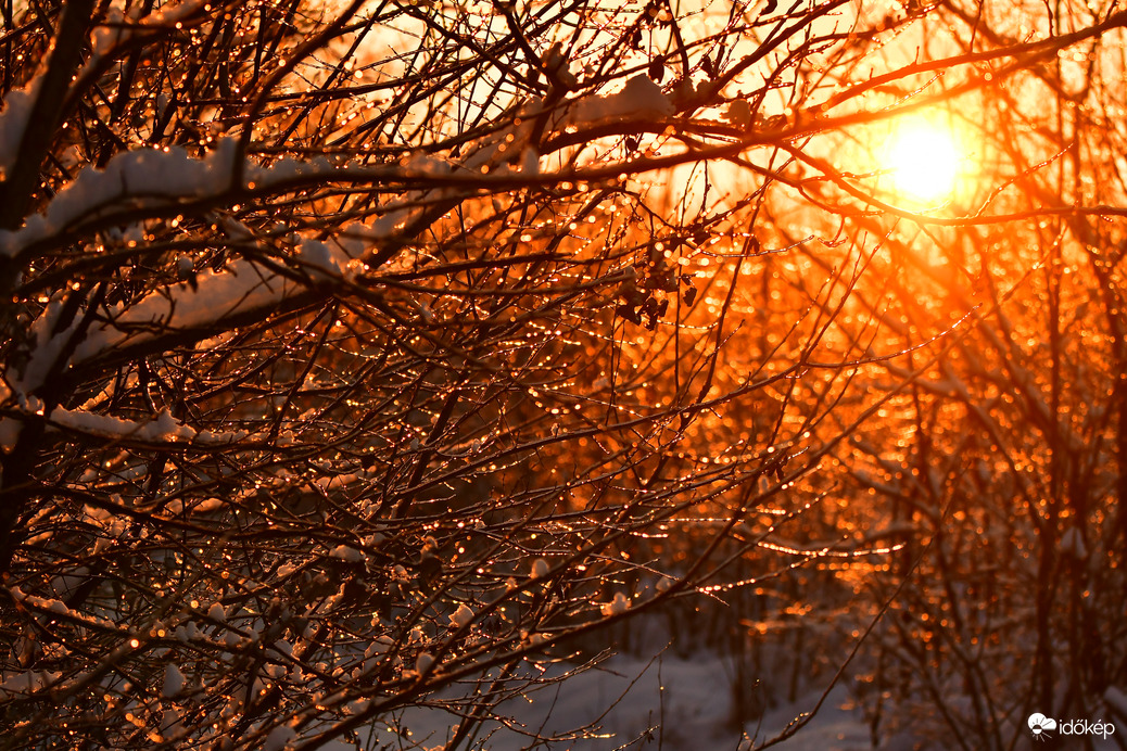 Gyönyörű kontraszt. Ezt imádom a téli naplementében. A vörösen izzó napkorong és a hideg, havas táj..