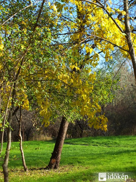 A levelek az őszt mutatják lassan, de a pázsit pimaszul tavaszi harsogó zöld.