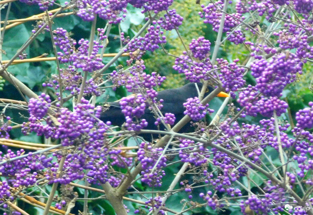 Először csak a sok gyönyörű lilabogyót figyeltem. Jól elbújt a rigó a bokorban.