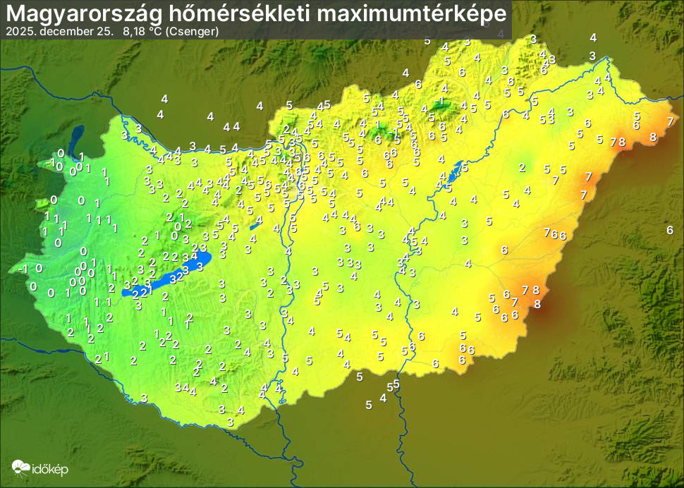 A maximumtérképen kirajzolódik az adott napon mért legmagasabb hőmérsékletek térbeli eloszlása. Az adott nap hőmérsékleti maximumát télen reggel és este 7 óra, nyáron reggel és este 8 óra között mért legmagasabb értékkel adjuk meg. Adatbeküldés: következő nap reggel 4 óráig.