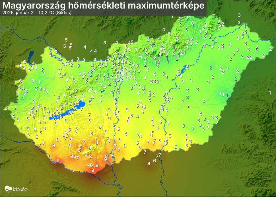 A maximumtérképen kirajzolódik az adott napon mért legmagasabb hőmérsékletek térbeli eloszlása. Az adott nap hőmérsékleti maximumát télen reggel és este 7 óra, nyáron reggel és este 8 óra között mért legmagasabb értékkel adjuk meg. Adatbeküldés: következő nap reggel 4 óráig.