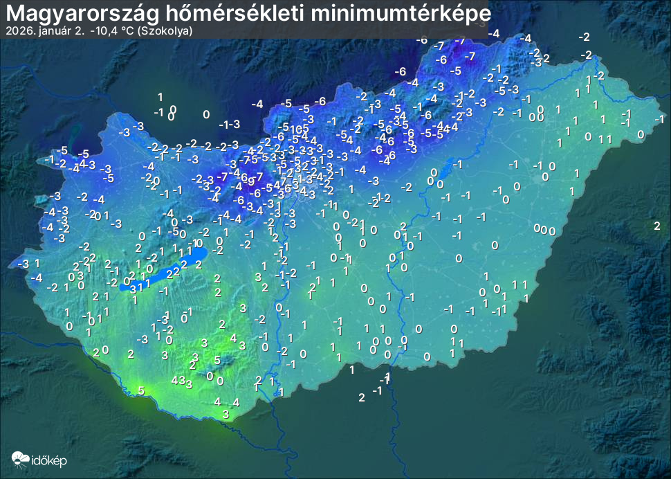 A minimumtérképen kirajzolódik az adott éjszaka mért legalacsonyabb hőmérsékletek térbeli eloszlása. Az adott nap hőmérsékleti minimumát télen előző este 7 és aznap reggel 7 óra, nyáron előző este 8 és aznap reggel 8 óra között mért legalacsonyabb értékkel adjuk meg. Adatbeküldés: aznap délután 4 óráig.