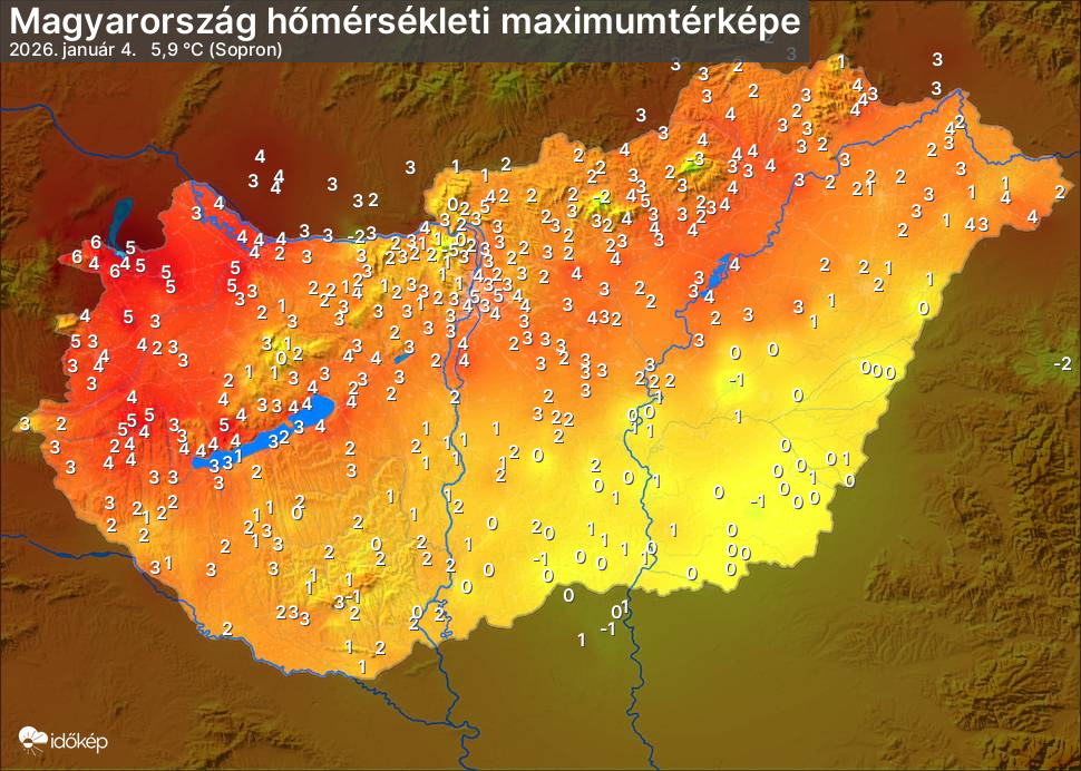 A maximumtérképen kirajzolódik az adott napon mért legmagasabb hőmérsékletek térbeli eloszlása. Az adott nap hőmérsékleti maximumát télen reggel és este 7 óra, nyáron reggel és este 8 óra között mért legmagasabb értékkel adjuk meg. Adatbeküldés: következő nap reggel 4 óráig.