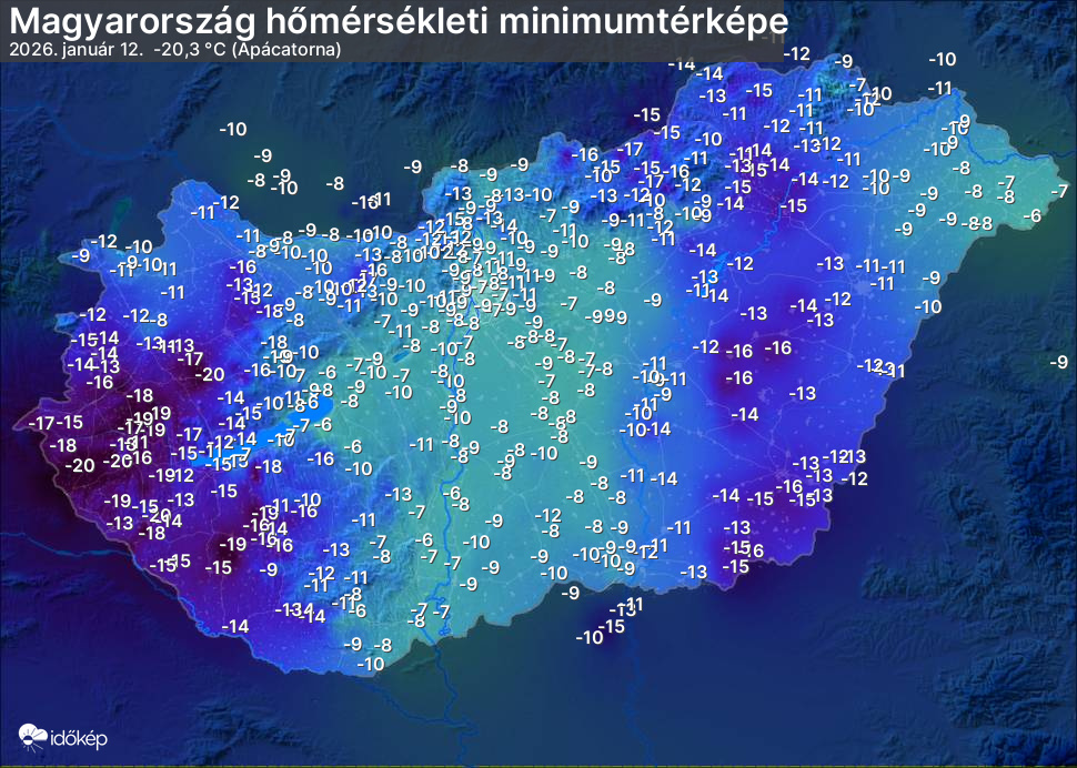 A minimumtérképen kirajzolódik az adott éjszaka mért legalacsonyabb hőmérsékletek térbeli eloszlása. Az adott nap hőmérsékleti minimumát télen előző este 7 és aznap reggel 7 óra, nyáron előző este 8 és aznap reggel 8 óra között mért legalacsonyabb értékkel adjuk meg. Adatbeküldés: aznap délután 4 óráig.
