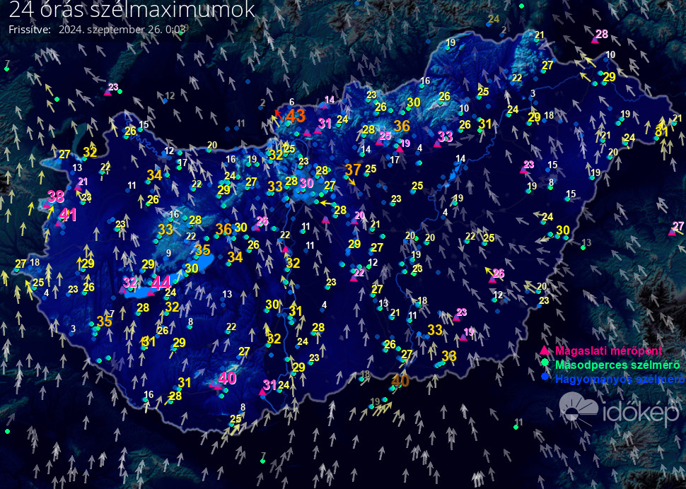 5 percenként frissítve, az elmúlt 24 óra méréseiből,