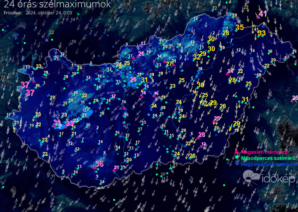 5 percenként frissítve, az elmúlt 24 óra méréseiből,