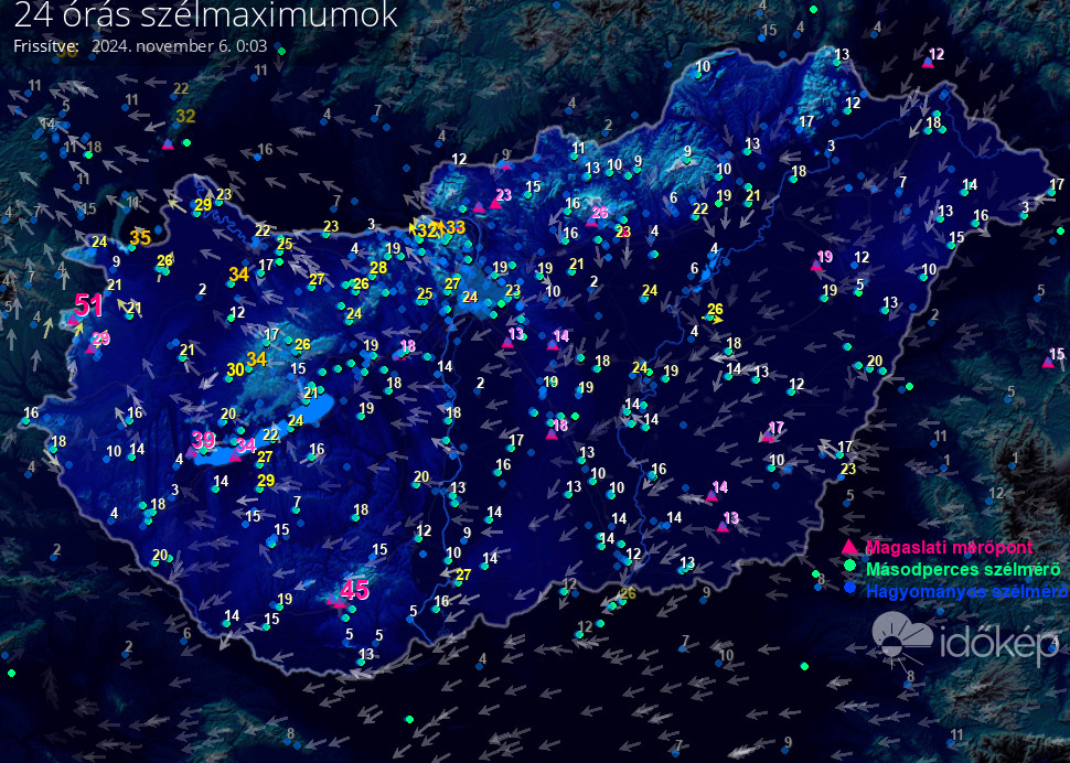 5 percenként frissítve, az elmúlt 24 óra méréseiből,