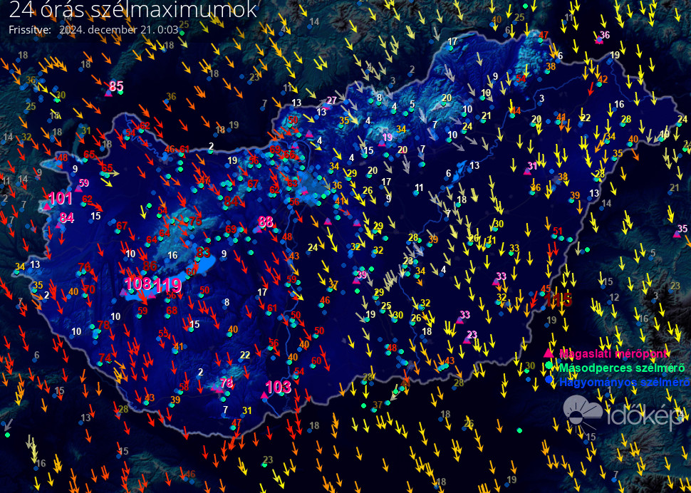 Térképünkön az elmúlt napon született legmagasabb szélerősség értéket jelenítjük meg.