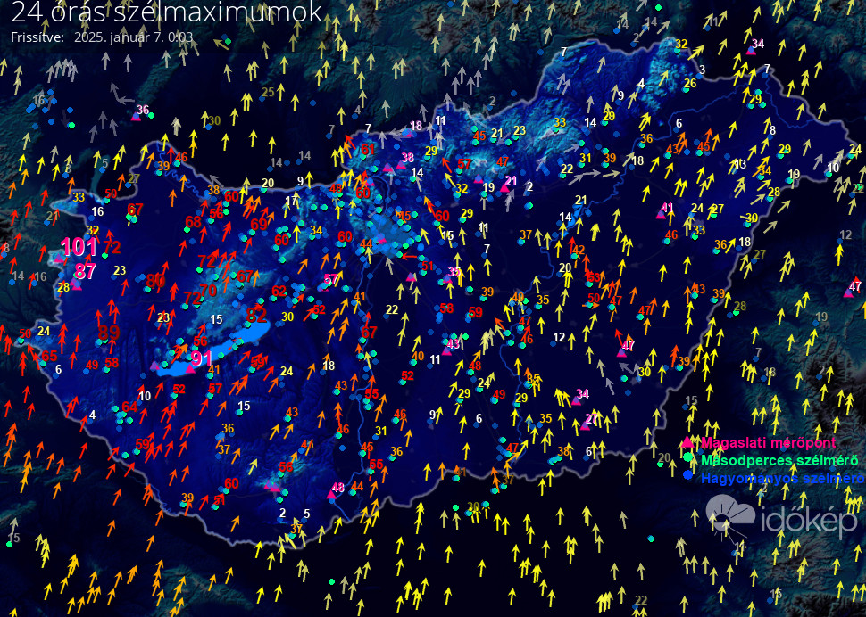 Térképünkön az elmúlt napon született legmagasabb szélerősség értéket jelenítjük meg.