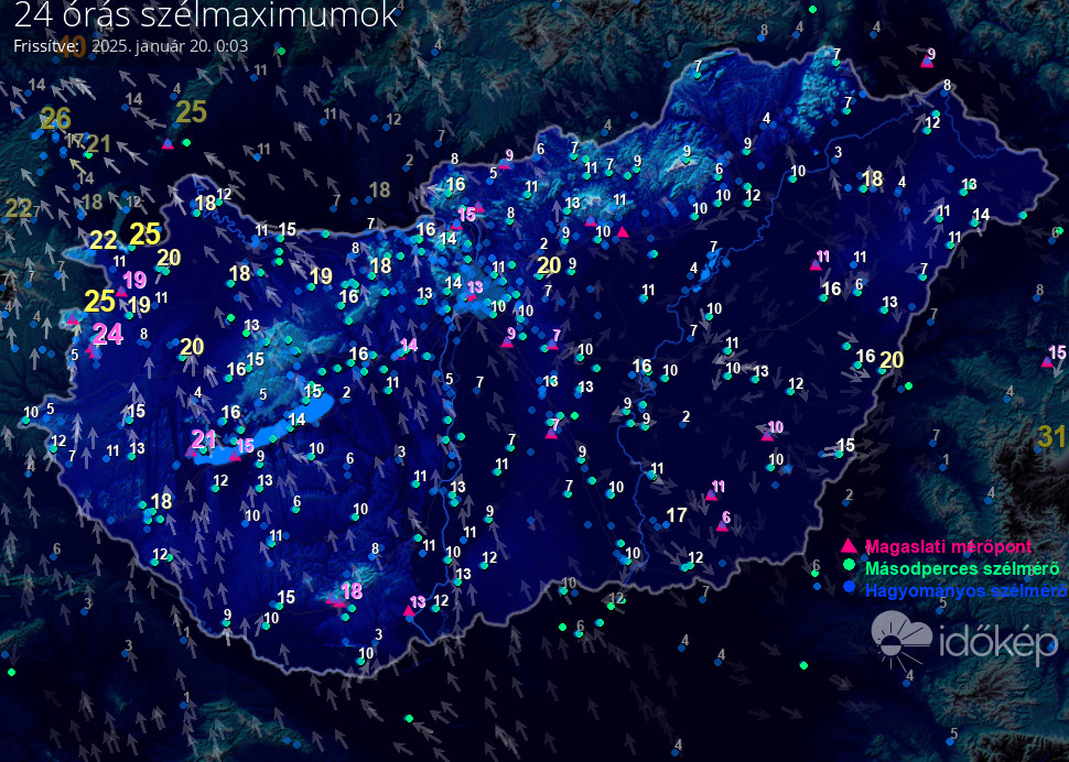 Térképünkön az elmúlt napon született legmagasabb szélerősség értéket jelenítjük meg.